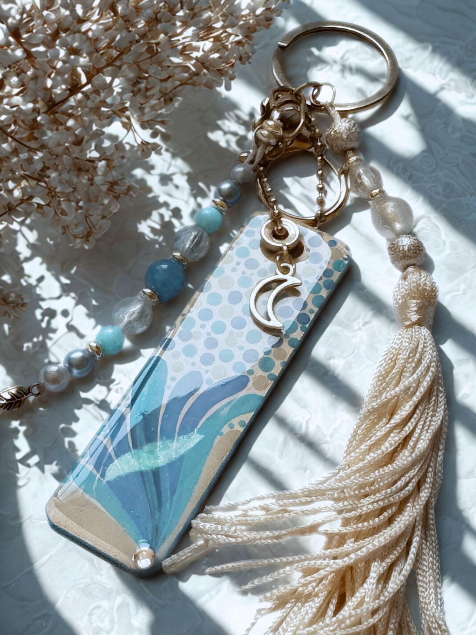 Feito à mão em MDF, com pintura em mandala nos tons de azul, pedrarias selecionadas e um delicado pingente de lua. Uma peça que transmite calma e boas energias, perfeita para quem ama carregar arte e significado no dia a dia.