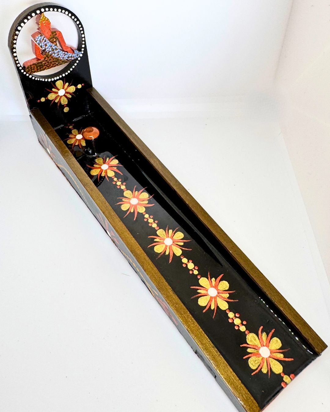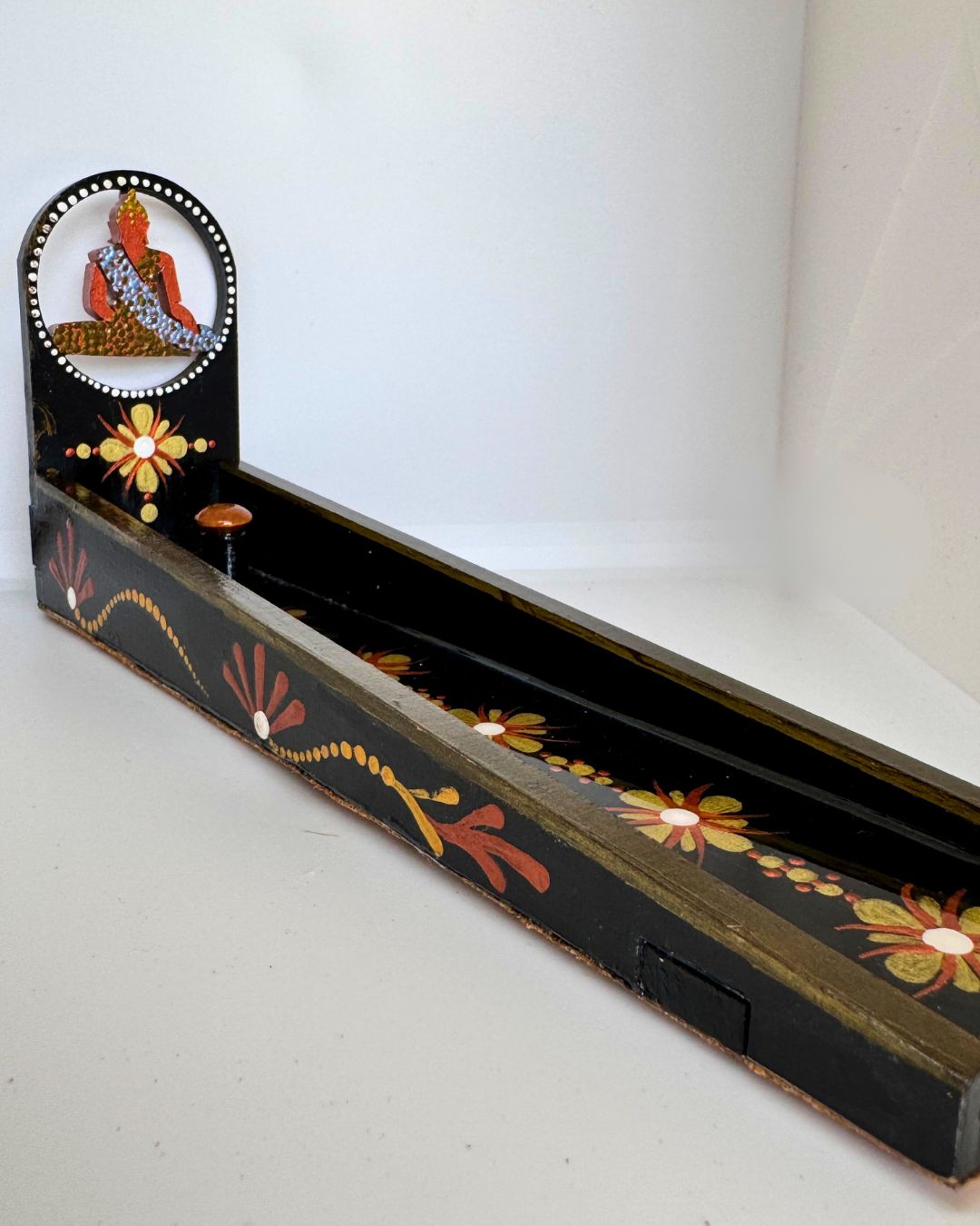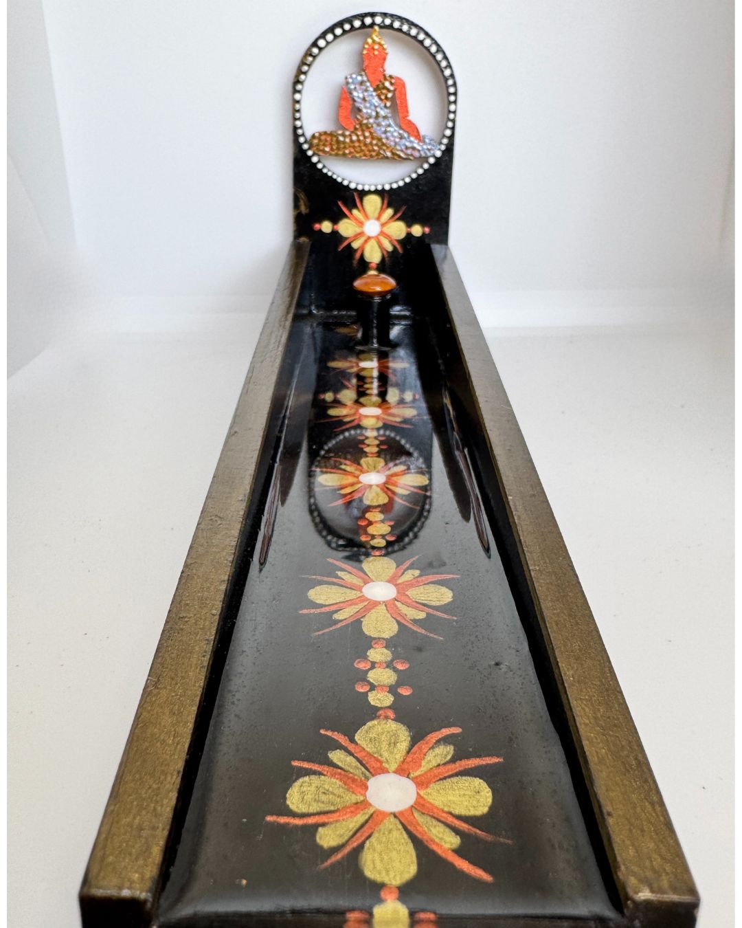 Feito em madeira, pintado à mão com flores douradas e detalhes vibrantes, traz a imagem de Buda em posição de serenidade, transmitindo paz e equilíbrio. A camada de resina adiciona brilho, proteção e sofisticação, tornando-o também uma peça decorativa única.