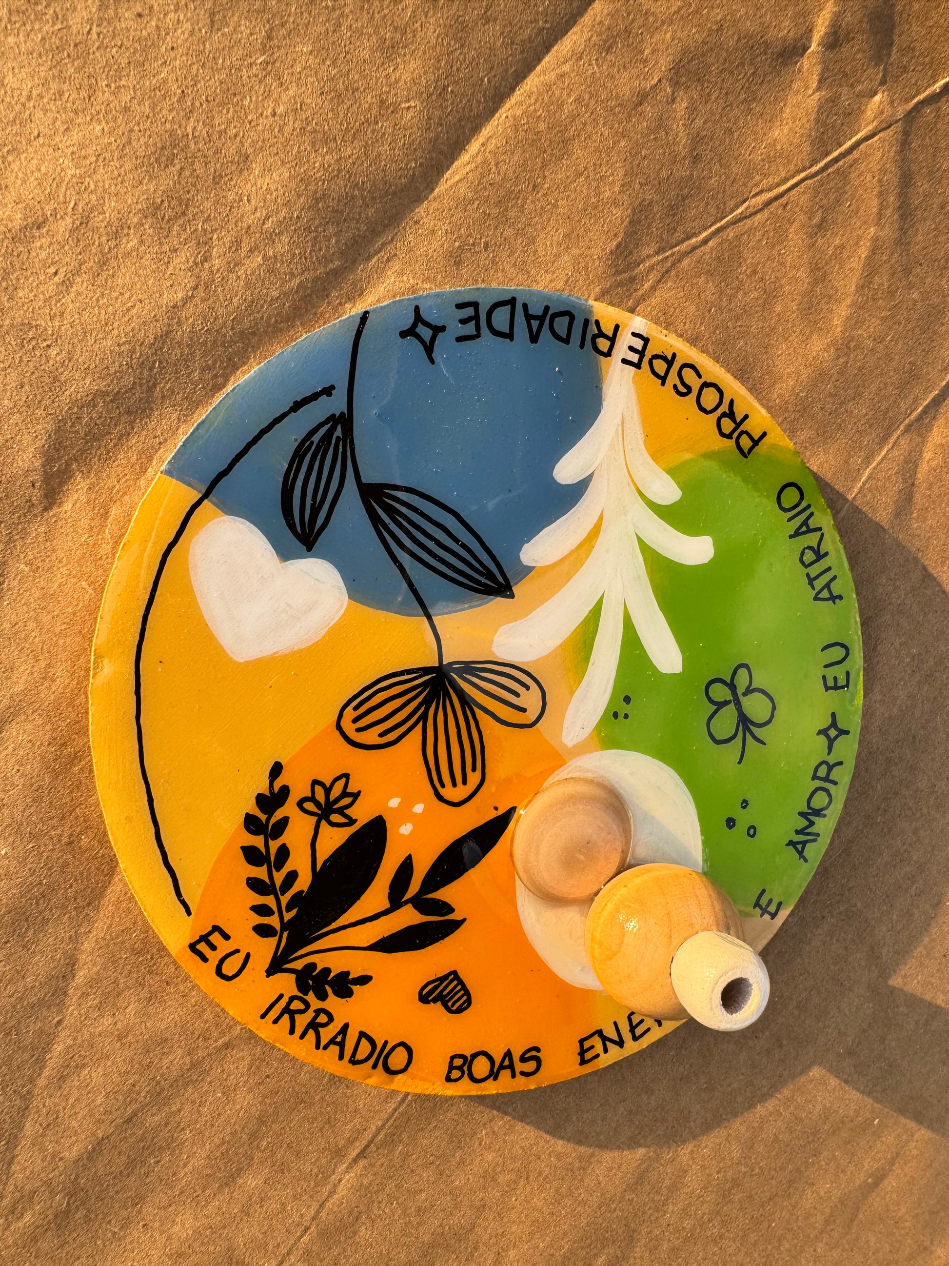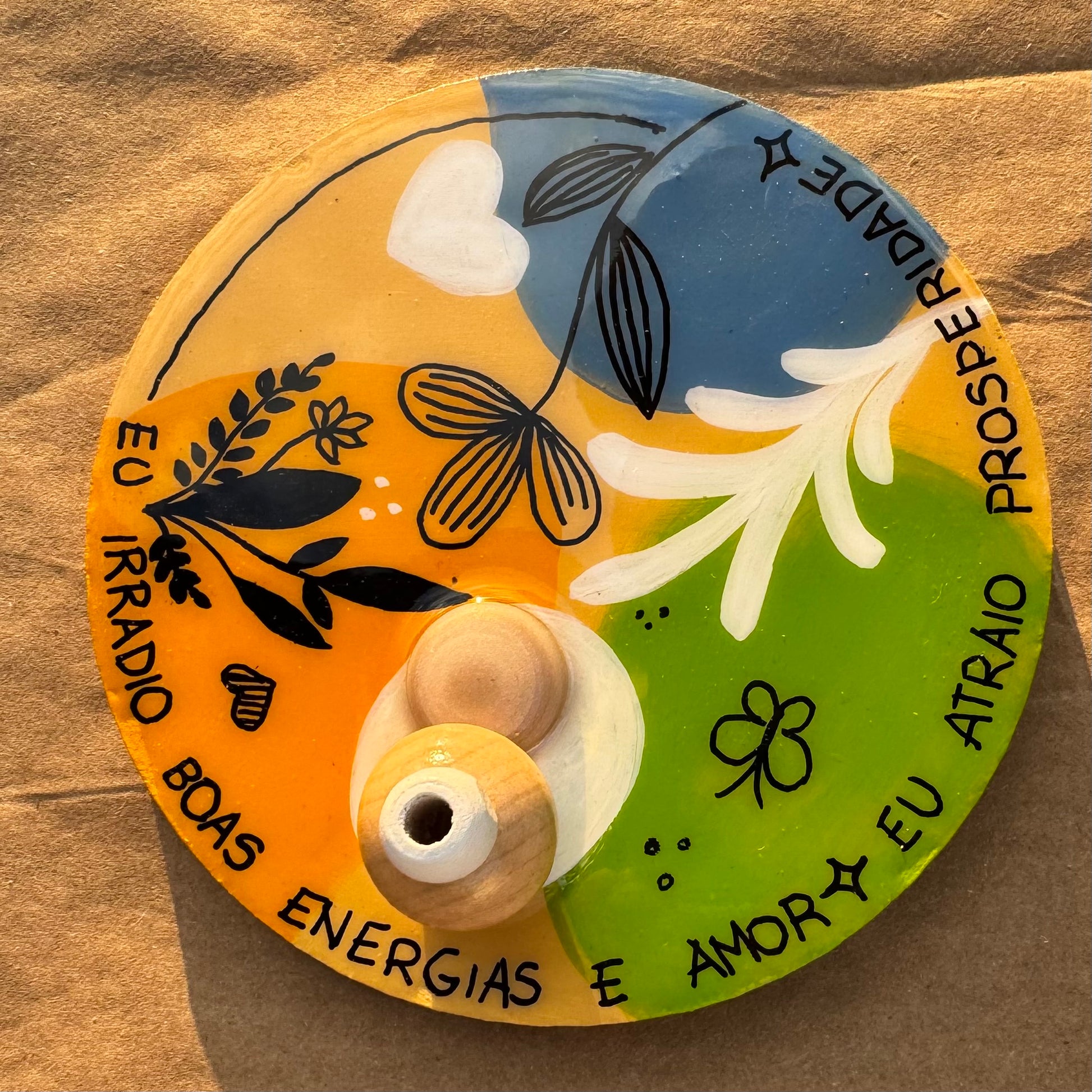 Pintado em cores vibrantes e protegido com acabamento em resina, traz frases poderosas:
