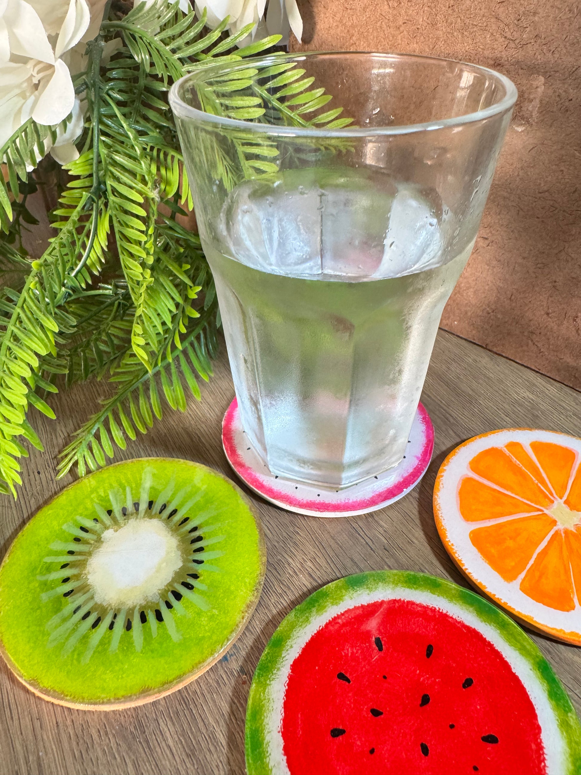 Leve mais cor e proteção para sua mesa com este conjunto artesanal de porta-copos em MDF, pintados à mão com ilustrações vibrantes de frutas tropicais. Cada peça recebe acabamento em resina, garantindo brilho, durabilidade e fácil limpeza, além de base em cortiça para proteger seus móveis contra riscos e umidade.