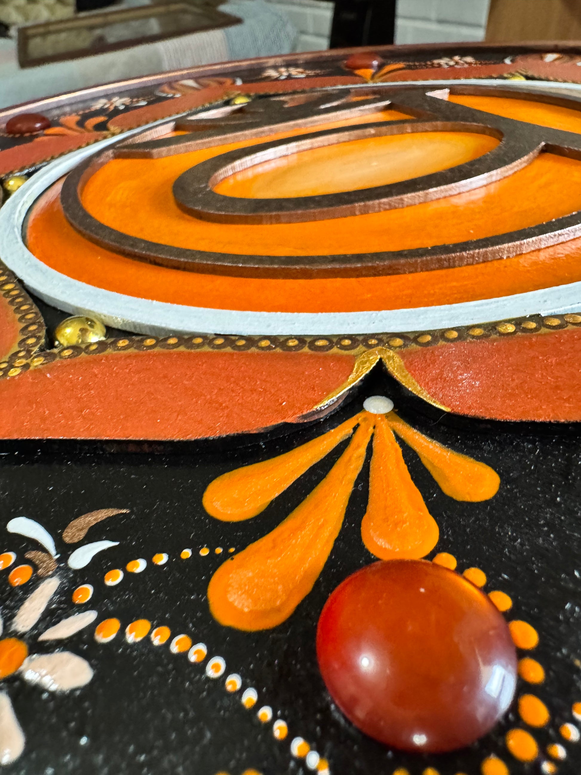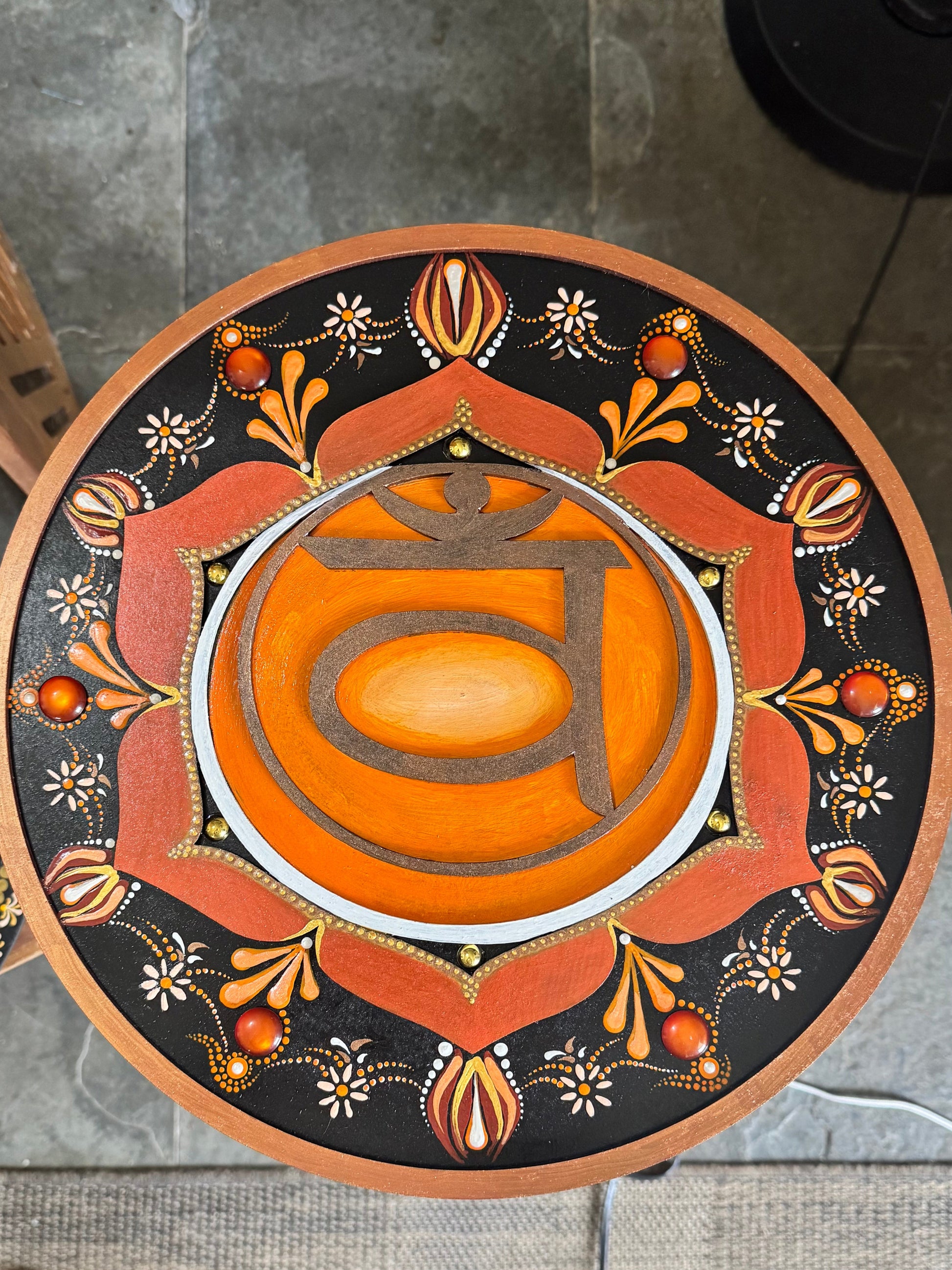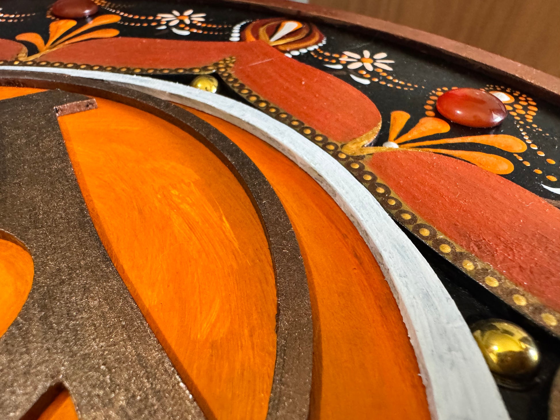 Peça decorativa exclusiva, feita à mão sobre MDF de alta qualidade, com aplicação em relevo, pintura em tons vibrantes de laranja e cobre, pedrarias e detalhes dourados. Representa o Chakra Svadhisthana, responsável por estimular a criatividade, a sensualidade e a conexão com os prazeres da vida.