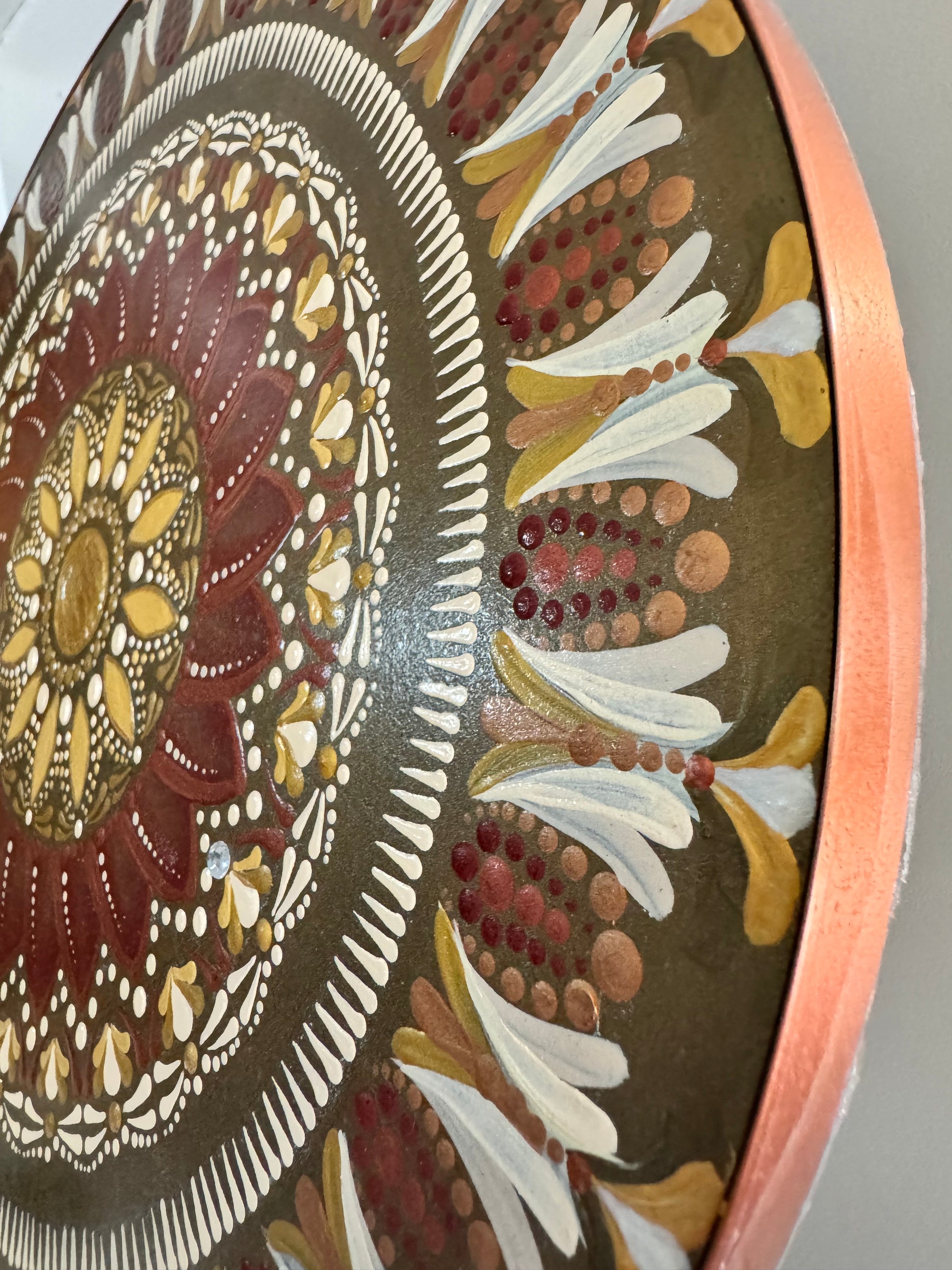 Mandala de 30 cm feita sobre MDF de 6 mm com aro posterior que garante estrutura e presença (1.2 cm de espessura total).