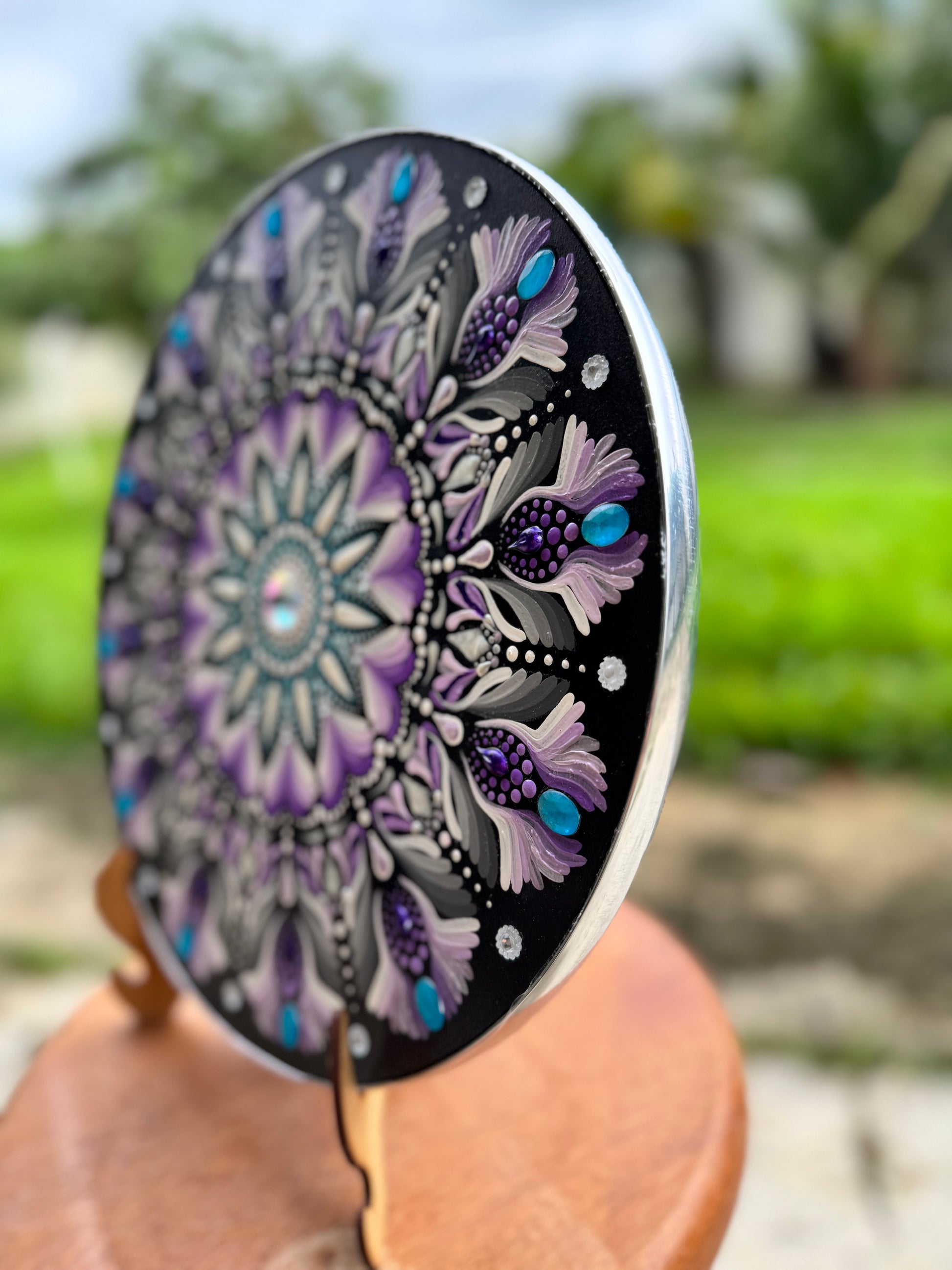 Mandala de 30 cm, feita em MDF com 6 mm + aro traseiro que confere 1.2 cm de espessura total. Recebe acabamento em fita de PVC prata — criando um efeito sofisticado e moderno — e aplicação central com ponto de brilho.